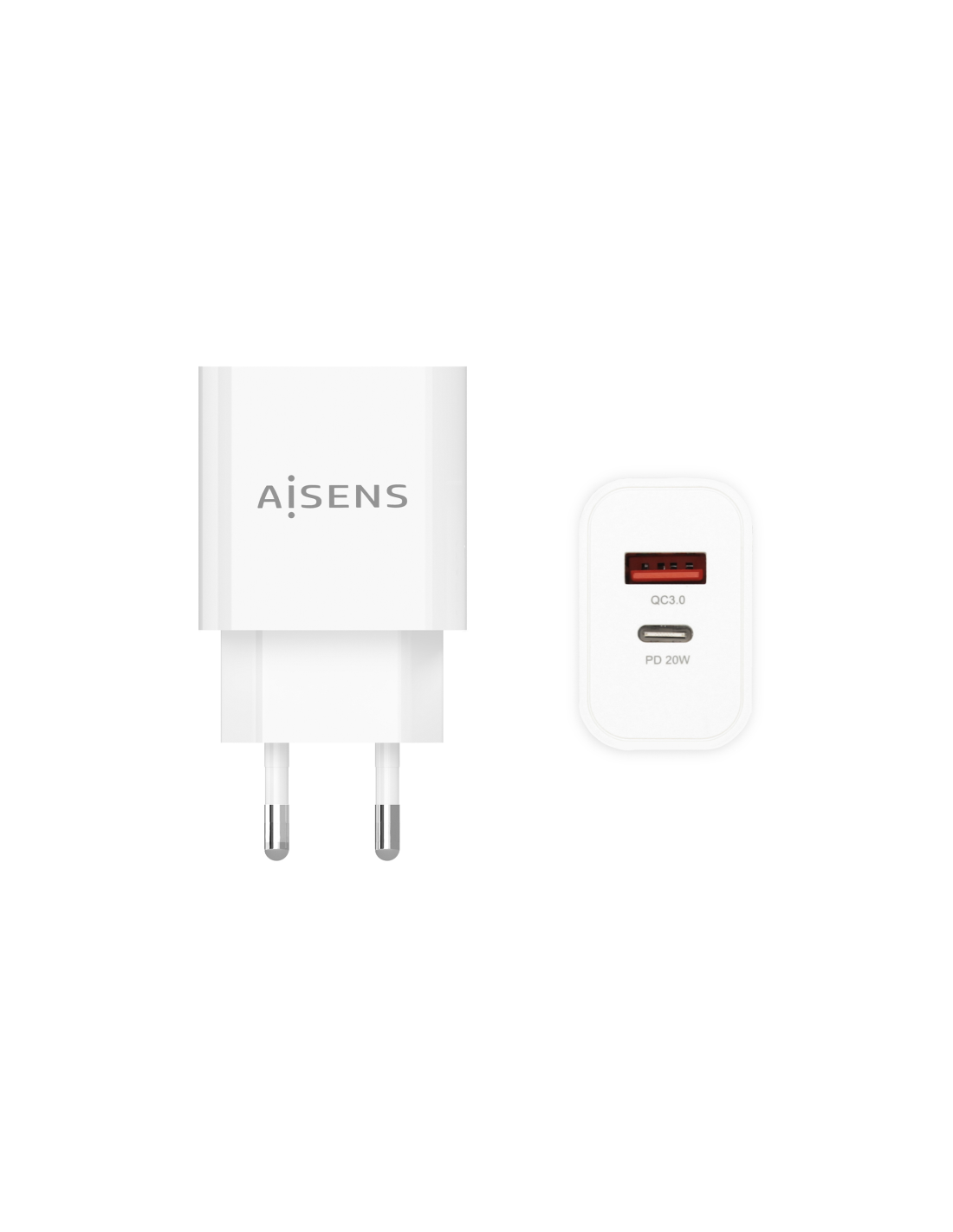 AISENS Cargador 20W, 1xUSB-C PD3.0, 1xUSB-A QC3.0, Blanco, Interior, Corriente alterna, Blanco