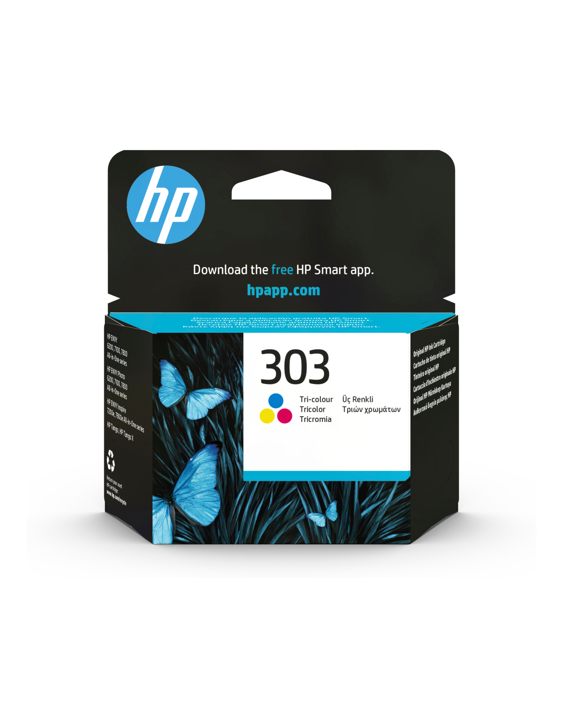 HP Cartucho de tinta Original 303 tricolor. Tipo de cartucho de tinta: Rendimiento estándar, Tipo de tinta de color: Tinta a base de colorante, Rendimiento de impresión de página con tinta de color: 165 páginas, Volumen de tinta de color: 4 ml, Cantidad por paquete: 1 pieza(s)
