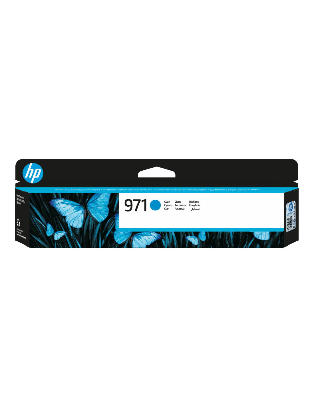 HP Cartucho de tinta original 971 cian. Tipo de cartucho de tinta: Rendimiento estándar, Tipo de tinta de color: Tinta a base de pigmentos, Rendimiento de impresión de página con tinta de color: 2500 páginas, Volumen de tinta de color: 24,5 ml, Cantidad por paquete: 1 pieza(s)