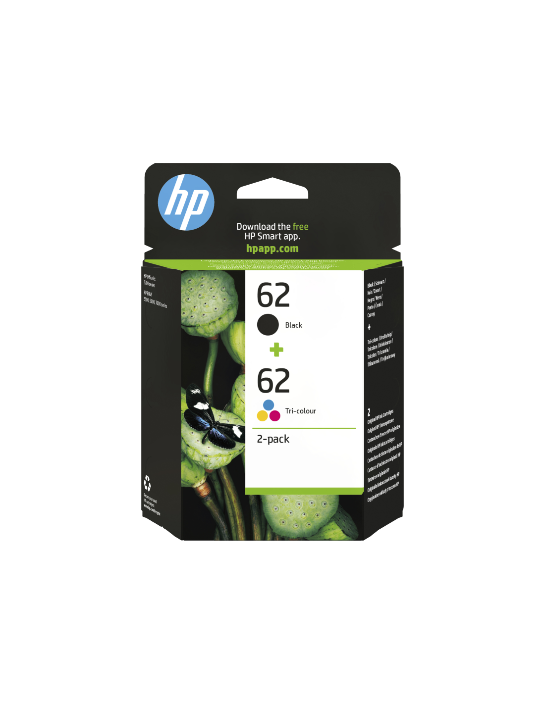 HP Pack de ahorro de 2 cartuchos de tinta original 62 negro/tricolor. Tipo de cartucho de tinta: Alto rendimiento (XL),Tipo de tinta negra: Tinta a base de pigmentos, Tipo de tinta de color: Tinta a base de colorante, Tipo de suministro: Multipack, Rendimiento de impresión de página con tinta de color: 165 páginas, Cantidad por paquete: 2 pieza(s),Rendimiento de impresión de página con tinta negra: 200 páginas
