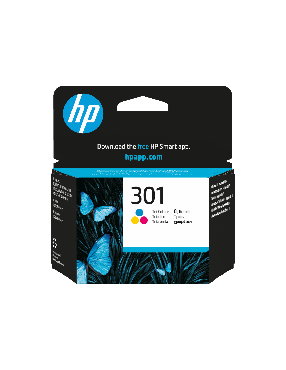 HP Cartucho de tinta original 301 Tri-color. Tipo de cartucho de tinta: Rendimiento estándar, Tipo de tinta de color: Tinta a base de colorante, Rendimiento de impresión de página con tinta de color: 165 páginas, Cantidad por paquete: 1 pieza(s)