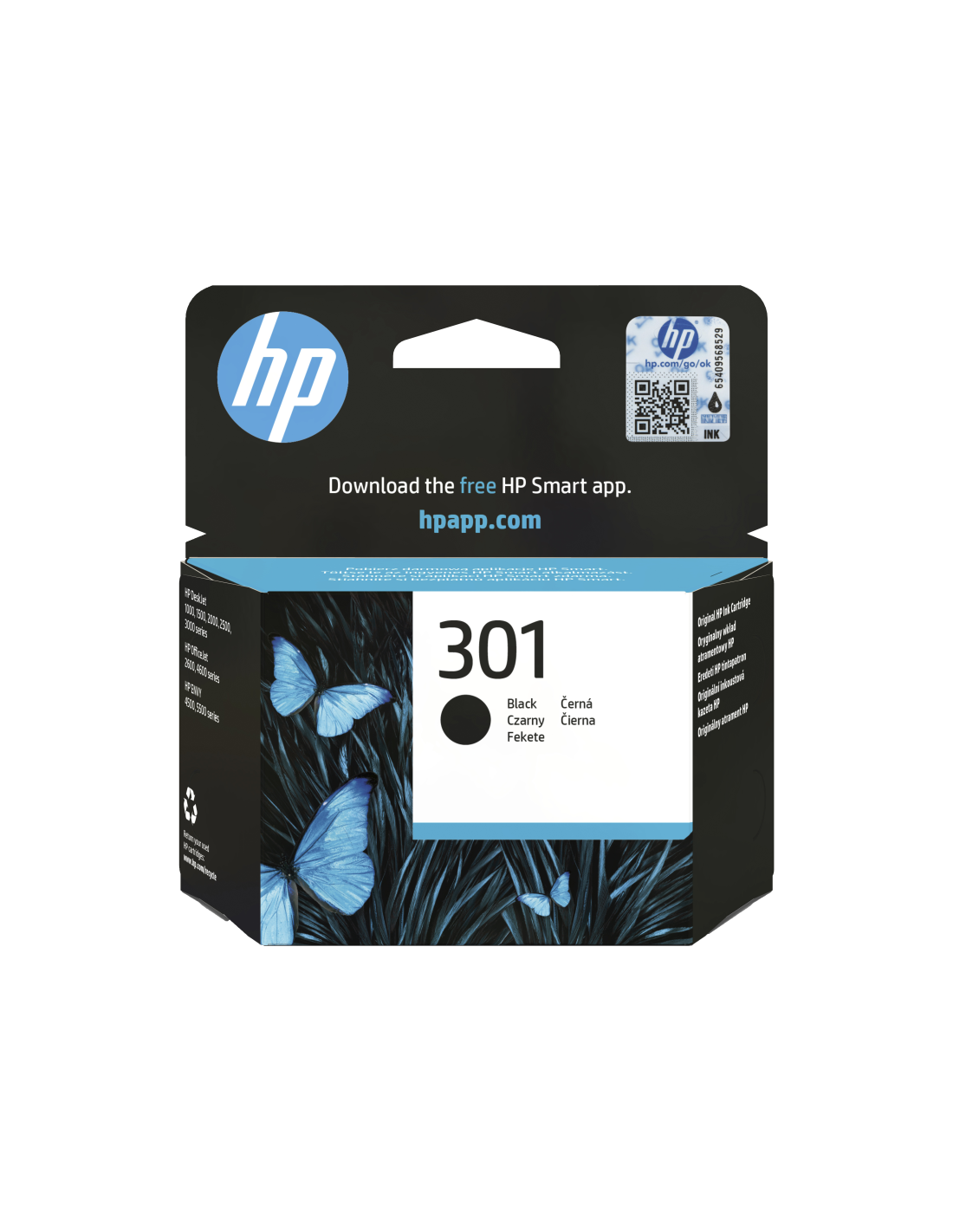 HP Cartucho de tinta original 301 negro. Tipo de cartucho de tinta: Rendimiento estándar, Tipo de tinta negra: Tinta a base de pigmentos, Volumen de tinta negra: 3 ml, Tipo de suministro: Pack individual, Cantidad por paquete: 1 pieza(s),Rendimiento de impresión de página con tinta negra: 170 páginas