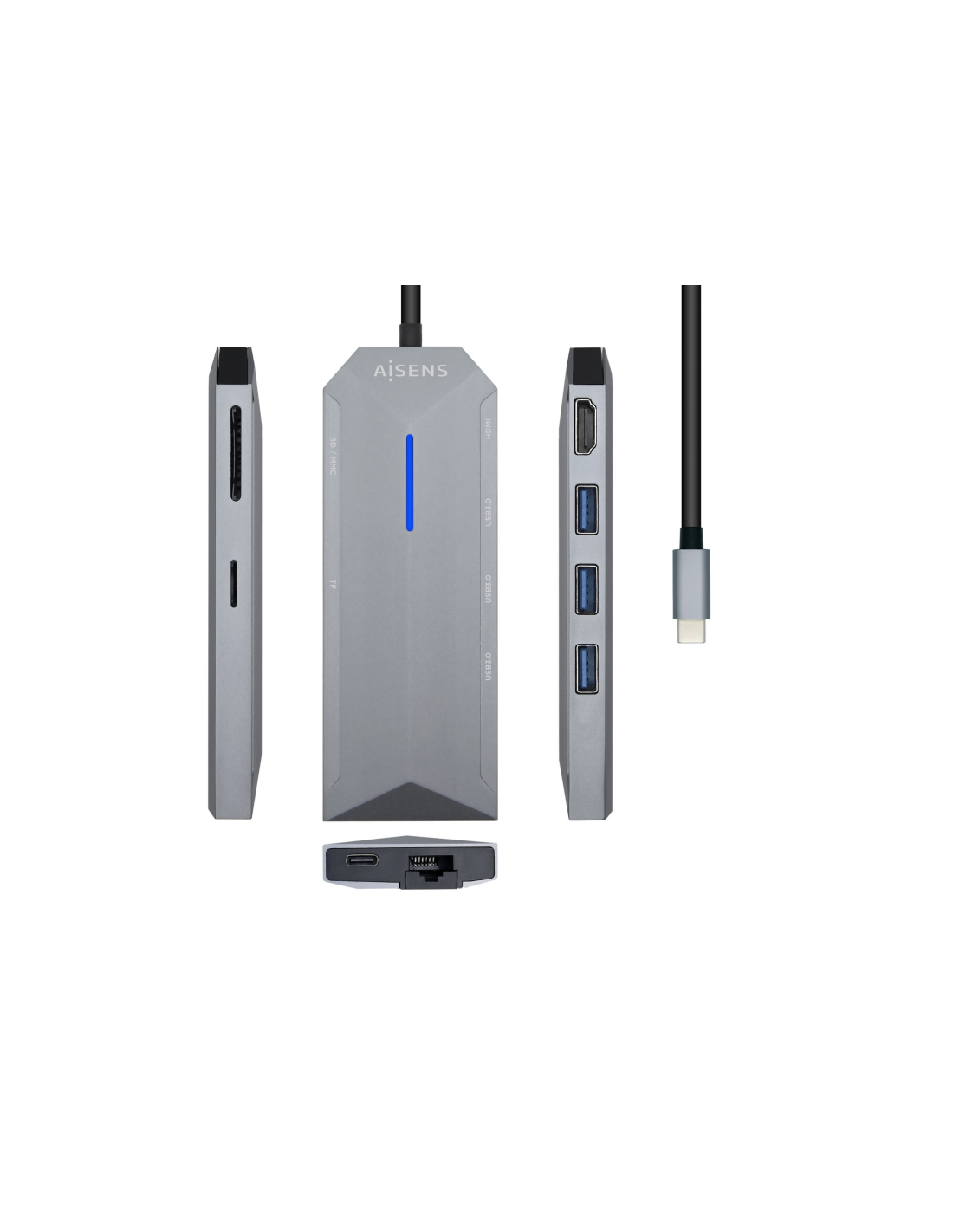 AISENS® – Conversor USB-C a 1xHDMI, 1xRJ45, 3xUSB, 1xPD 100W, 1xLector de tarjeta SD, 1xLector de tarjeta MICRO SD