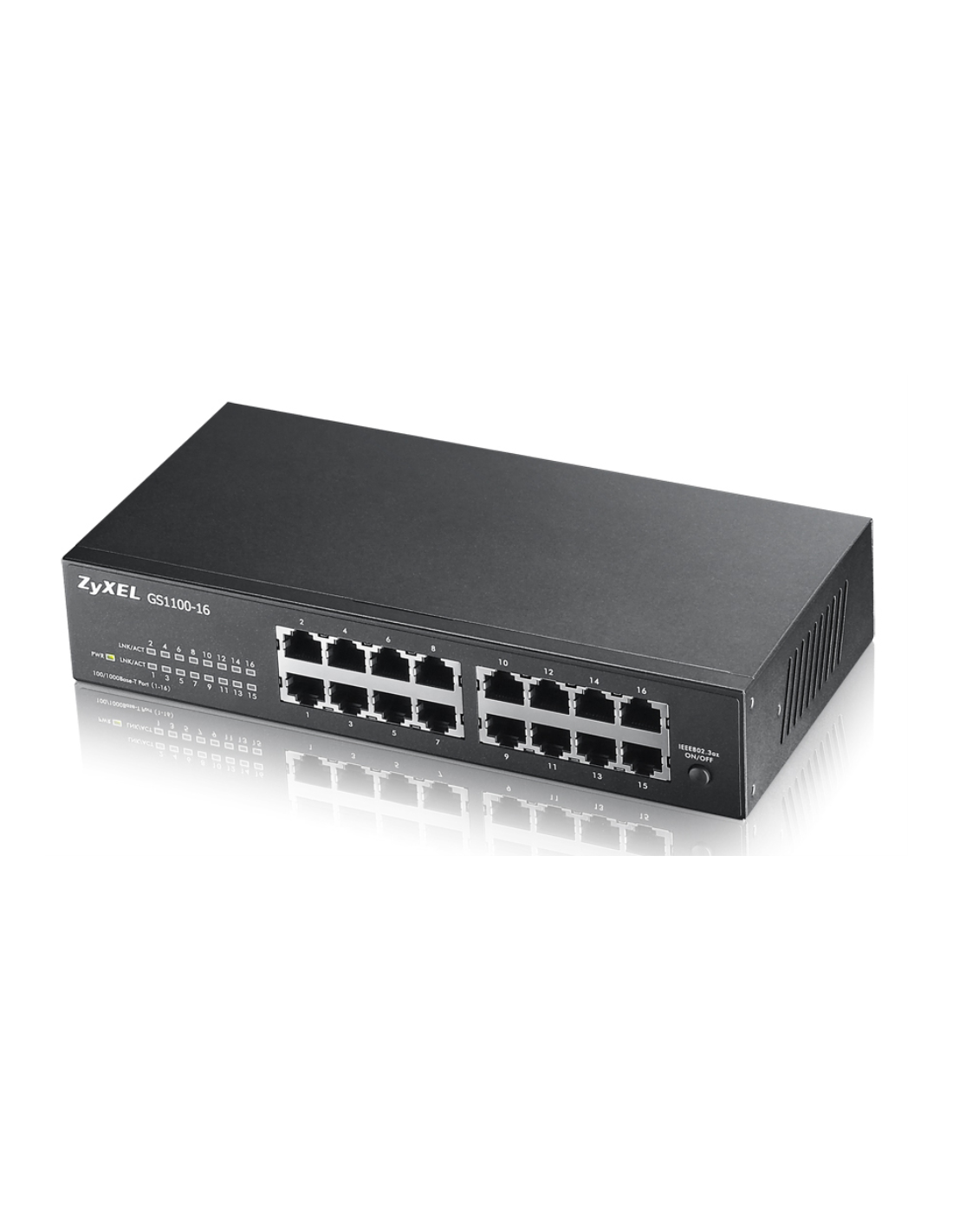 Zyxel GS1100-16. Tipo de interruptor: No administrado. Puertos tipo básico de conmutación RJ-45 Ethernet: Gigabit Ethernet (10/100/1000),Cantidad de puertos básicos de conmutación RJ-45 Ethernet: 16. Tabla de direcciones MAC: 8000 entradas, Capacidad de conmutación: 32 Gbit/s. Estándares de red: IEEE 802.1p, IEEE 802.3, IEEE 802.3ab, IEEE 802.3az, IEEE 802.3u, IEEE 802.3x, IEEE 802.3z. Montaje de pared, Montaje en rack