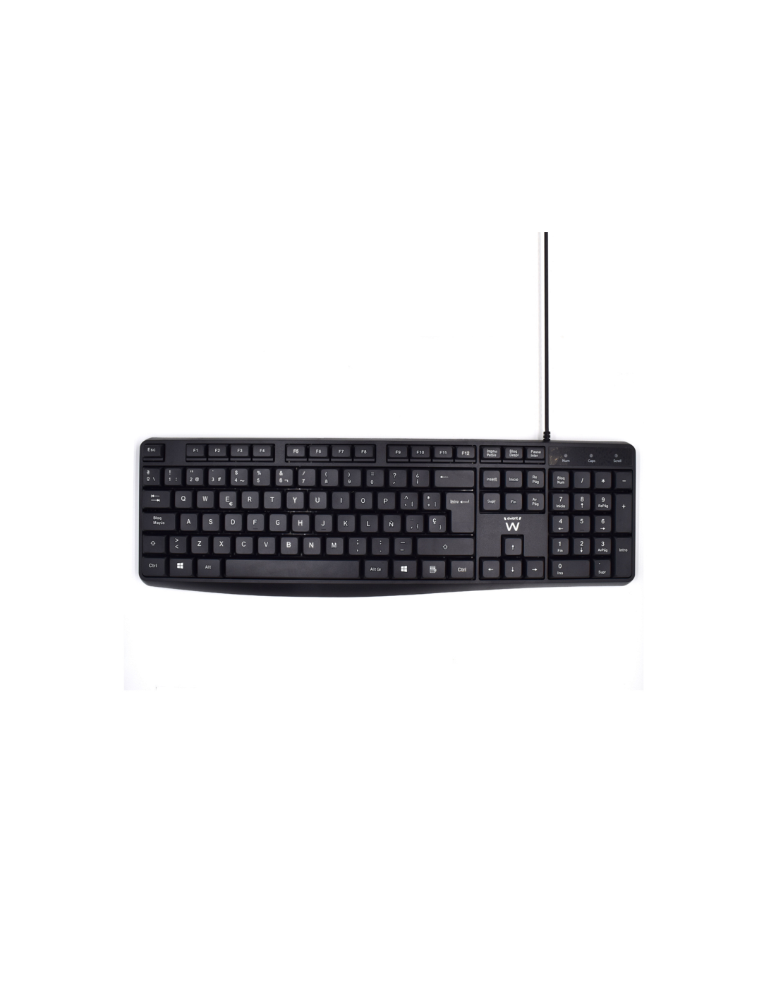 Ewent EW3001. Formato del teclado: Completo (100%). Estilo de teclado: Derecho. Interfaz del dispositivo: USB, Interruptor del teclado: Interruptor de membrana, Diseño de teclado: QWERTY, Teclado, cantidad de teclas: 104. Longitud de cable: 1,35 m. Uso recomendado: Oficina. Color del producto: Negro